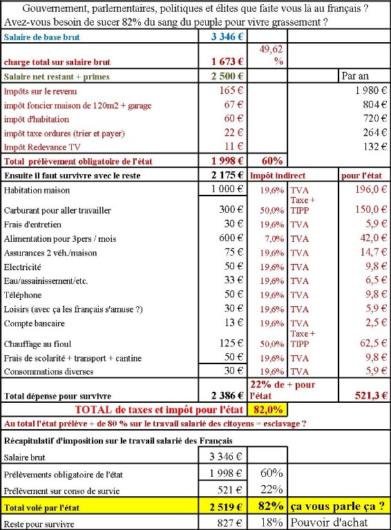 C’est très simple, on dit que vous travaillez 1 jour pour vous et 1 jour pour l’Etat (50% pas plus comme aime nous le répéter notre président, M. Nicolas SARKOSY de NAGY-BOSCA), ceci est complètement faux et aberrant car nous sommes dépossédés de plus de 80 % de notre revenu, et il ne reste donc plus que 18% de notre dur labeur, non pas de pouvoir d’achat, mais de pouvoir survivre.